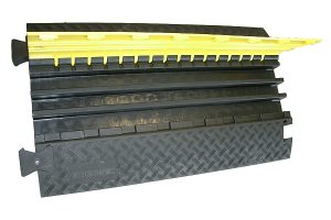 The cable bridge X6 has been developed to protect against heavy trucks and is equipped with a non-slip yellow warning cover. This carries a tire load of 5 tons (20 x 20 cm). The cable bridges can be connected to each other by means of moulded pins. The lid closes on an integrated patented zipper. A complete range of accessories with bends and end pieces extends the X6 cable bridge into a flexible system for protecting cables and hoses.