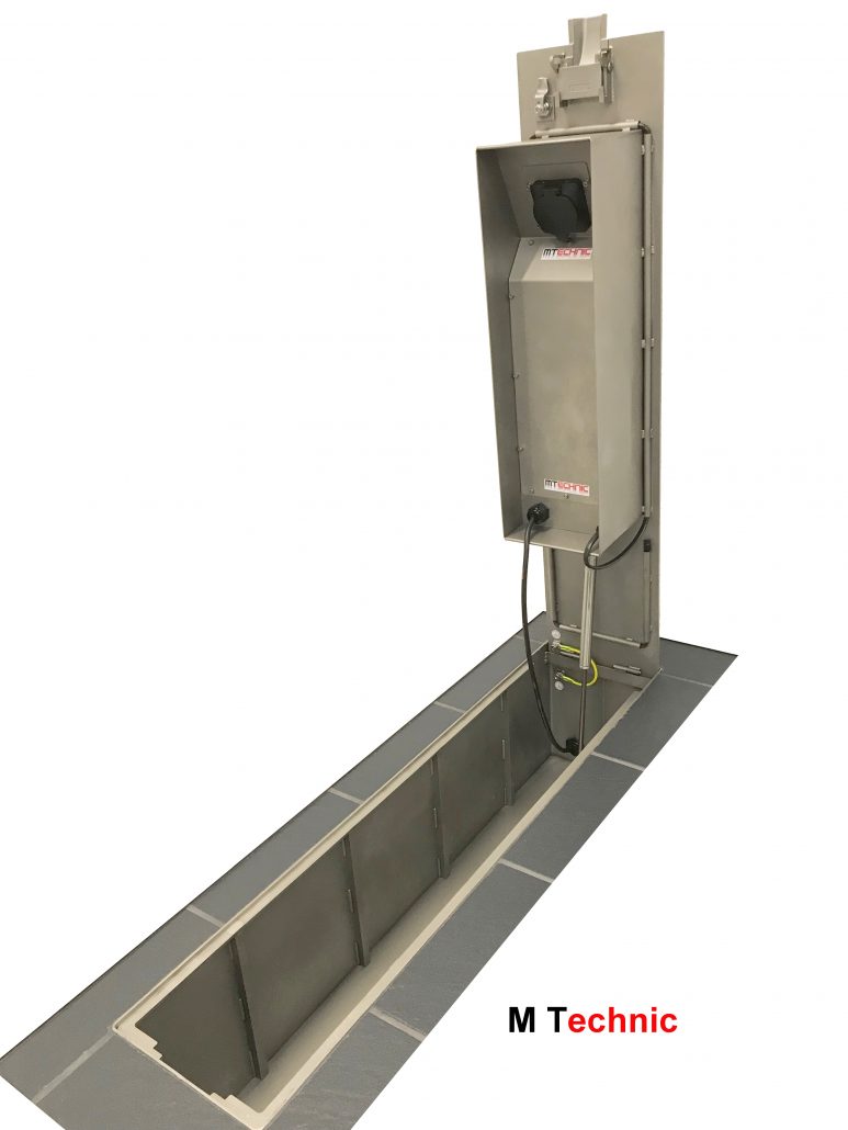 The charging socket is at a comfortable height after folding out so that you do not have to bend down. After plugging in the charging plug, the E Start is closed again. For this purpose, the cable is routed under the patented cable protection “PROtector” (load 12.5t or 40t) and protected.